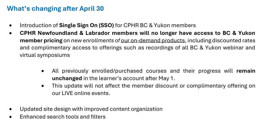 While CPHR-NL Members will still continue to enjoy the access to the complimentary offering of CPHR BC & Yukon live webinars, the access to their on-demand platform will be restricted to CPHR BC & Yukon Members only, starting May 1, 2026.